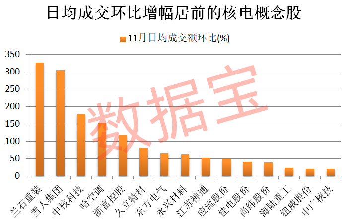 從成交情況來看,部分概念股近期成交活躍度大幅提升。據(jù)數(shù)據(jù)寶統(tǒng)計(jì),截至11月7日收盤,11月以來日均成交額較上個(gè)月增長(zhǎng)的有19只,其中9股環(huán)比增幅達(dá)50%以上。蘭石重裝(603169)、雪人集團(tuán)(002639)、中核科技(000777)、哈空調(diào)(600202)、浙富控股(002266)日均成交額環(huán)比增幅排在前五位。