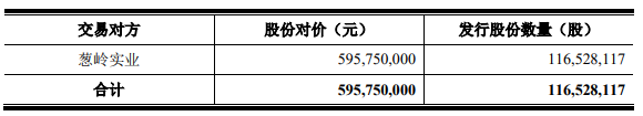 按照本次發(fā)行股份購買資產的發(fā)行價格5.1125元/股計算,上市公司本次發(fā)行股份購買資產發(fā)行的股票數量總計為116,528,117股,向蔥嶺實業(yè)發(fā)行股份的情況如下: