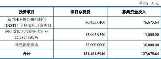 本次發(fā)行募集資金總額不超過(含)127,675.64萬元,扣除發(fā)行費用后的募集資金凈額將用于新型HIV整合酶抑制劑(INSTI)全球臨床開發(fā)項目、向少數(shù)股東收購南大藥業(yè)22.2324%股權、補充流動資金。